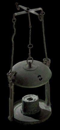 Lumina survive from the eruption; most elaborate is the bronze lantern from Oplontis (right). As the British Museum exhibition notes: “The lanterns they carried were fuelled by olive oil stored in the cylindrical reservoir at the base, and originally had shades made of thin sheets of animal horn” (parchment shades were also possible). Small holes in the lantern hood would have allowed smoke to exit and provided oxygen to the flame. See Pompeii in Pictures II.4.8 for a location where two such bronze lanterns were recovered along the Via dell’Abbondanza. There is a definitive study of bronze lamps from Pompeii and Herculaneum, though most lamps were made of terracotta.