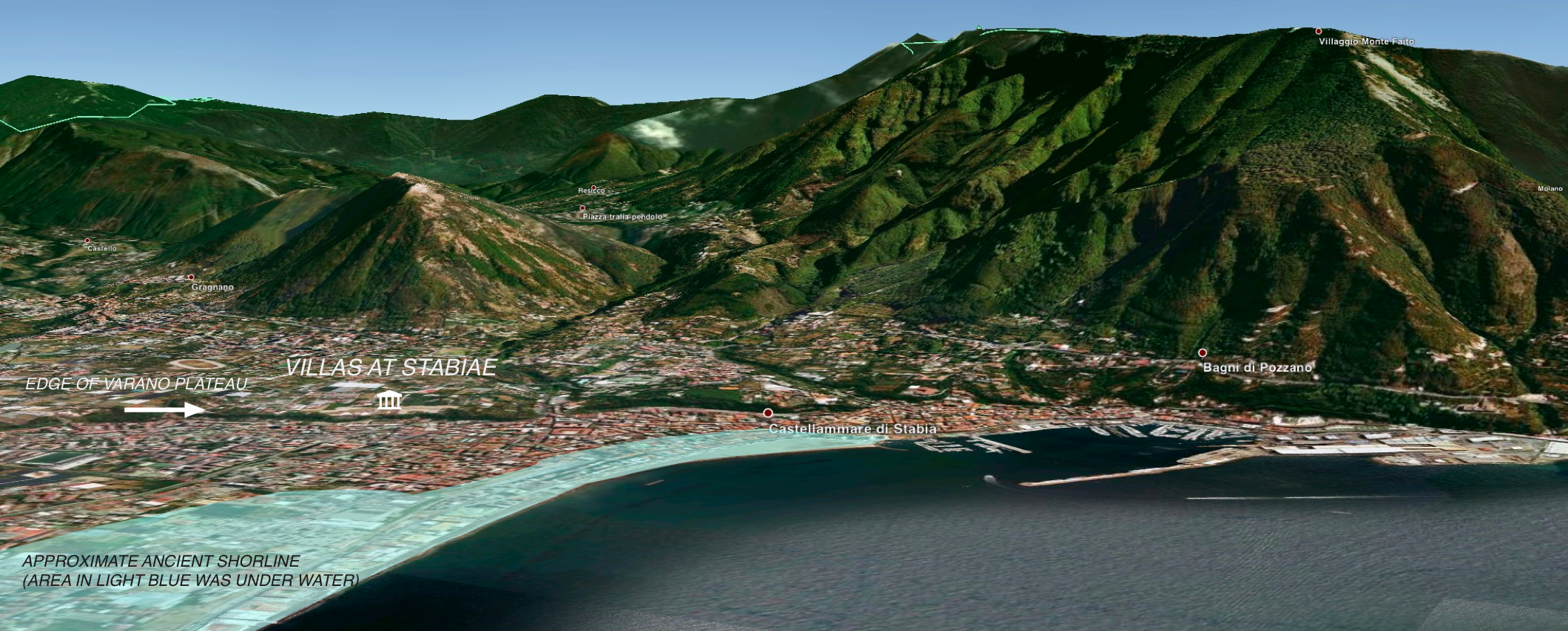 Stabiae area from the NW, showing Varano plateau and approximate ancient shoreline. Map imagery from Google Earth. Shoreline estimate from M. Mastroroberto and G. Bonifacio, “Ricerche archeologiche nell’ager stabinus,” in Bonifacio and Sodo, Stabiae (cited below), 154, fig. 1. Click on image to enlarge.