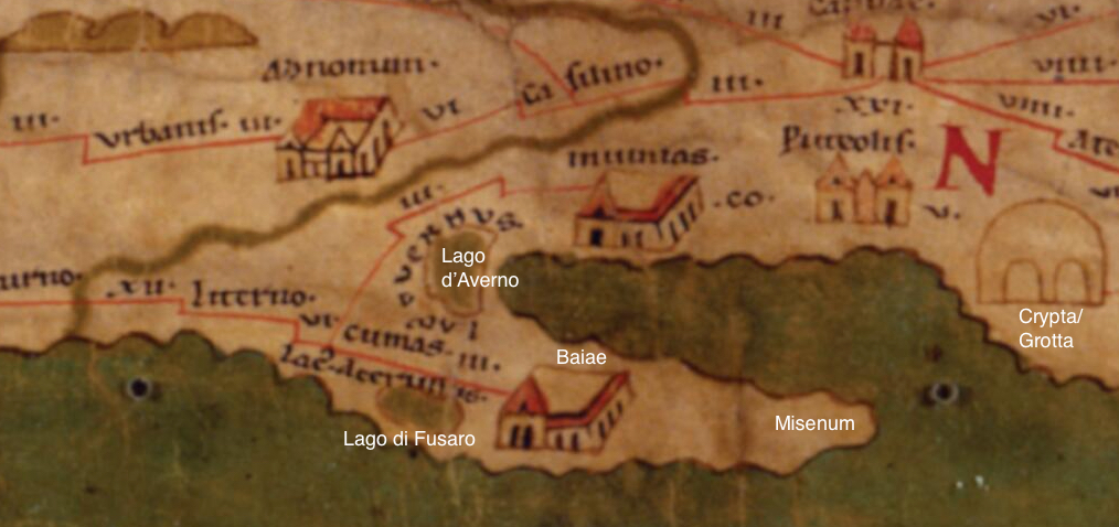 The present parchment version of the Tabula dates from the 13th c. AD, which was copied from a 4th-c. AD original (perhaps Constantinian), but the document has 1st c. AD details (such as towns marked for ‘Herculanum’ and ‘Pompeis’, which were never re-built), so the cartographic and iconographic data of our surviving map is a palimpsest. For instance, the half-oval perforated by two ‘archways’ to the right of Puteolis in the image below probably represents the ‘Crypta Neapolitana’ and/or ‘Grotta di Seano’, 700-m+ tunnels driven under the Pausilypon ridge that separates Neapolis from Puteoli, to shorten and straighten travel distance, first begun in the 30s BC on Agrippa’s orders (Strabo 5.4.5 mentions a third tunnel as connecting Cumae and Lake Avernus, which is called the Grotta di Cocceio, after its engineer, and is nearly 1 km. long). See L. Amato, et al., “The Crypta Neapolitana; a Roman tunnel of the early imperial age,” in More than two thousand years in the history of architecture, international congress proceedings (UNESCO, Paris, 2001).